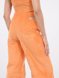 ALEKSANDRE AKHALKATSISHVILI orange pants, velvet construction, waist cut-outs, high-rise, concealed zip closure, fully lined, straight leg, full length, regular fit. 100% Cotton Standard Sizing Model is 5'8" wearing size S. Bust: 32" Waist: 26" Hips: 34.5"