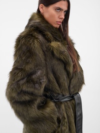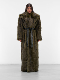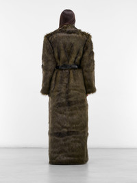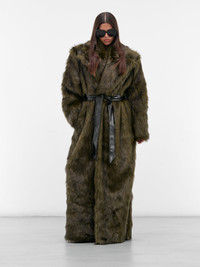 Brown coat in vegan fur with an oversized long-length profile, wide lapel, and a vegan leather belted fastening. Featuring: • Oversized fit • Wide lapel • Long sleeves • Vegan leather belted fastening • Side pockets • Lined • Made in Georgia • Outer: 83% Acrylic 17% Polyester | Lining: 100% Polyester • Standard sizing Model is 5'8" wearing size S. Bust: 32.5" Waist: 24" Hips: 34"