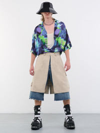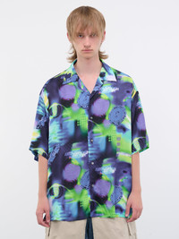 AMBUSH shirt in blue, bowling design, logo print, spread collar, mother of pearl button closure, short sleeves, boxy fit. European Sizing 100% Viscose Model is 6’1” wearing size 48. Shoulders: 18” Chest: 36” Waist: 28”