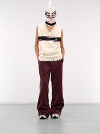 AMBUSH vest in tofu, paneled wool knit construction, distressing throughout, stripe pattern, v-neckline, ribbed collar, sleeveless, armscyes, chest logo embroidery, rib-knit hem, relaxed fit. Made in Italy 100% Virgin Wool Standard Sizing Model is 5'11.5" wearing size M. Shoulders: 18" Chest: 36" Waist: 30"