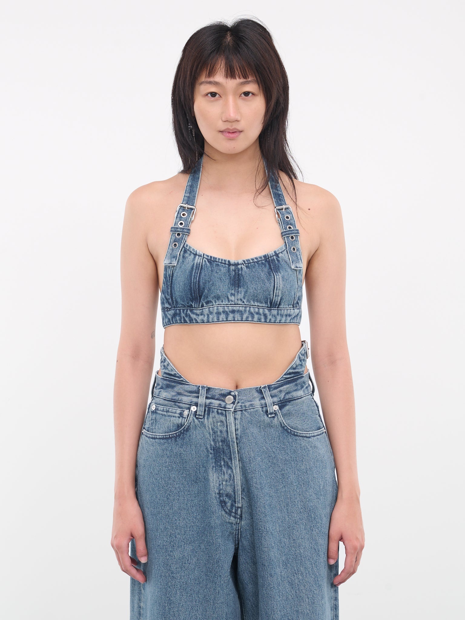 AMBUSH blue top, bra design, treated denim, adjustable belted straps, back button fastening, fitted. 100% Cotton US Sizing Model is 5'10" wearing size XS. Bust: 31" Waist: 23.5" Hips: 35"