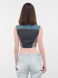 AMBUSH top in blue, paneled bustier design, denim construction, contrast inserts, square neckline, sleeveless, snap button closure, dual flap pockets, pointed hem, cropped, fitted. Standard Sizing 100% Cotton Model is 5'10" wearing size XS. Bust: 32" Waist: 24" Hips: 35"