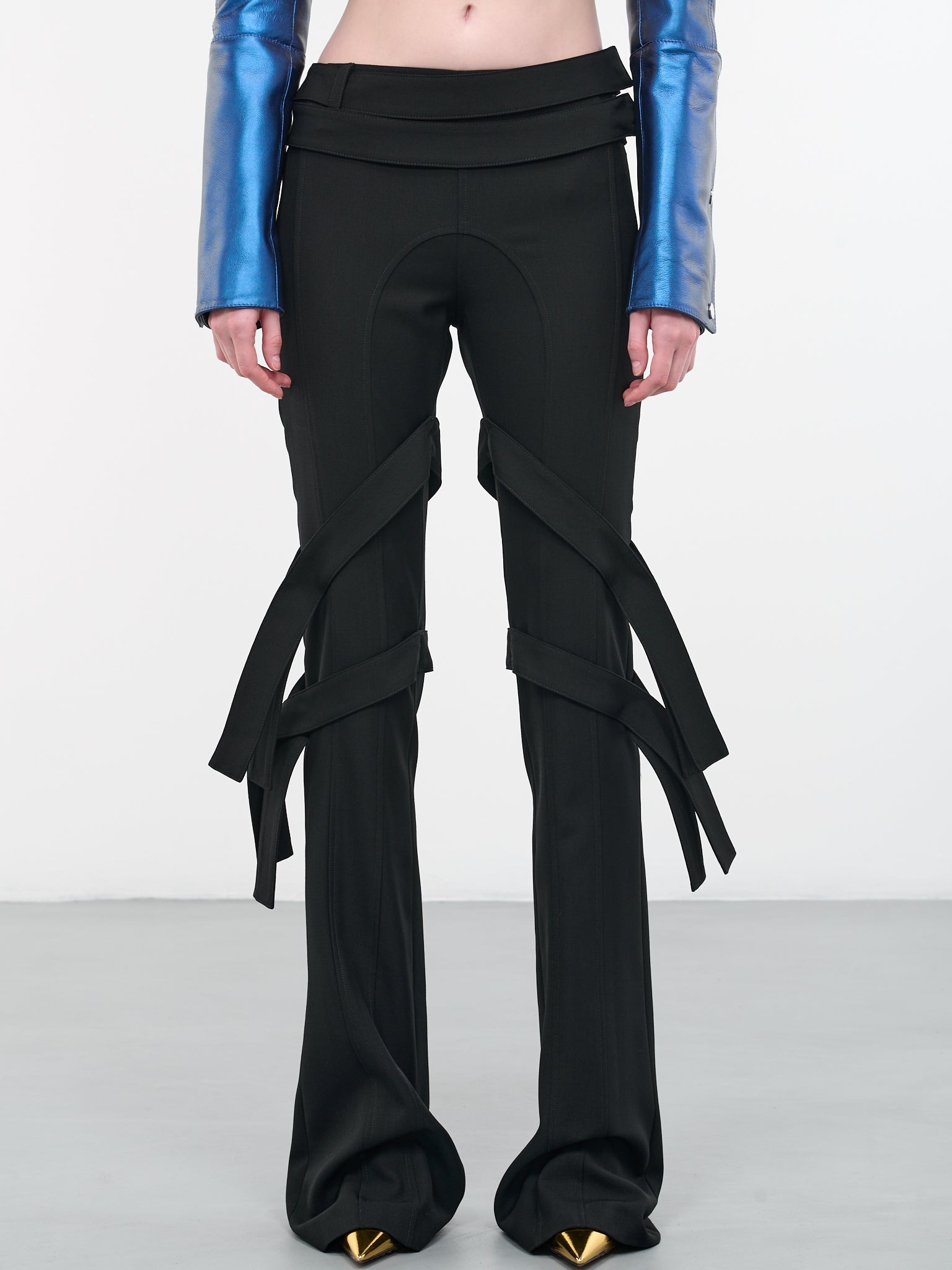 AMBUSH trousers in black, virgin wool, double waist design, integrated belts, seam detailing, press-stud fastening, leg straps, full length, slim fit. Italian Sizing Body - 100% Virgin Wool Details - 100% Viscose Model is 5'10" wearing size 38. Bust: 32" Waist: 25" Hips: 35"