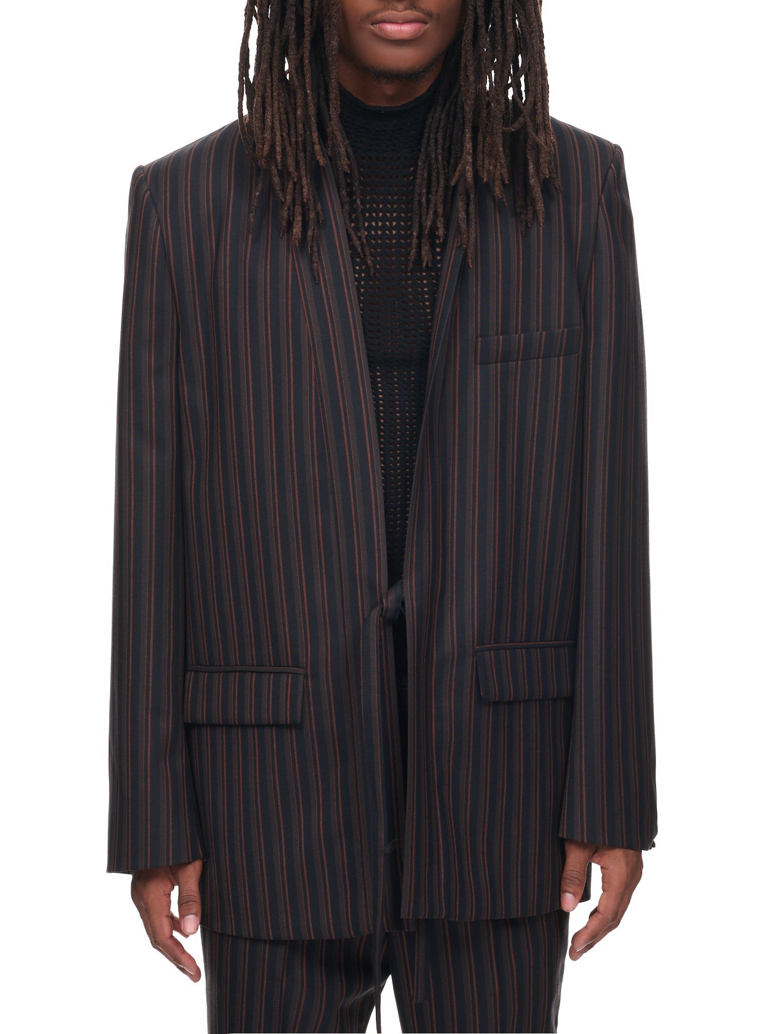 AMBUSH blazer in brown, kimono blazer design, stripe pattern, classic tie closure, chest welt pocket, side sewn flap pockets, back vent, tailored fit. European Sizing Main - 53% Polyester, 43% Virgin Wool, 4% Elastane Lining - 100% Cotton Model is 6’0” wearing size 48. Shoulders: 18.5” Chest: 36” Waist: 30”