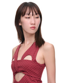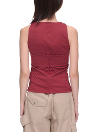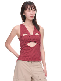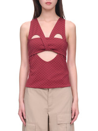 AMBUSH top in maroon, v-neck, heart shaped cut-off design, all-over monogram motif, sleeveless, fitted. Standard Sizing Composition: 77% Polyester, 22% Elastane Model is 5'10" and is wearing size XS. Bust: 28.5" Waist: 22" Hip: 34.5"