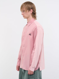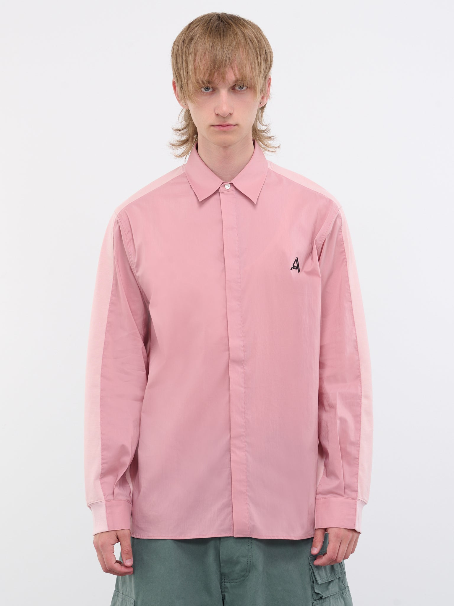 AMBUSH shirt in pink, paneled design, cotton twill & jersey, back graphic patch, pointed collar, concealed mother of pearl button closure, logo embroidery, long sleeves, straight hem, regular fit. Standard Sizing 100% Cotton Model is 6’1” wearing size S. Shoulders: 18” Chest: 36” Waist: 28”