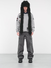 AMBUSH grey & navy sweatshirt, hoodie design, cotton construction, branded logo patch embellishment, drawstring fastening, dropped shoulders, kangaroo pocket, ribbed hem & cuffs, oversized fit. Made in Portugal 93% Cotton 7% Polyester Standard Sizing Model is 6’0” wearing size M. Shoulders: 19" Chest: 38” Waist: 30”