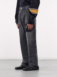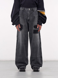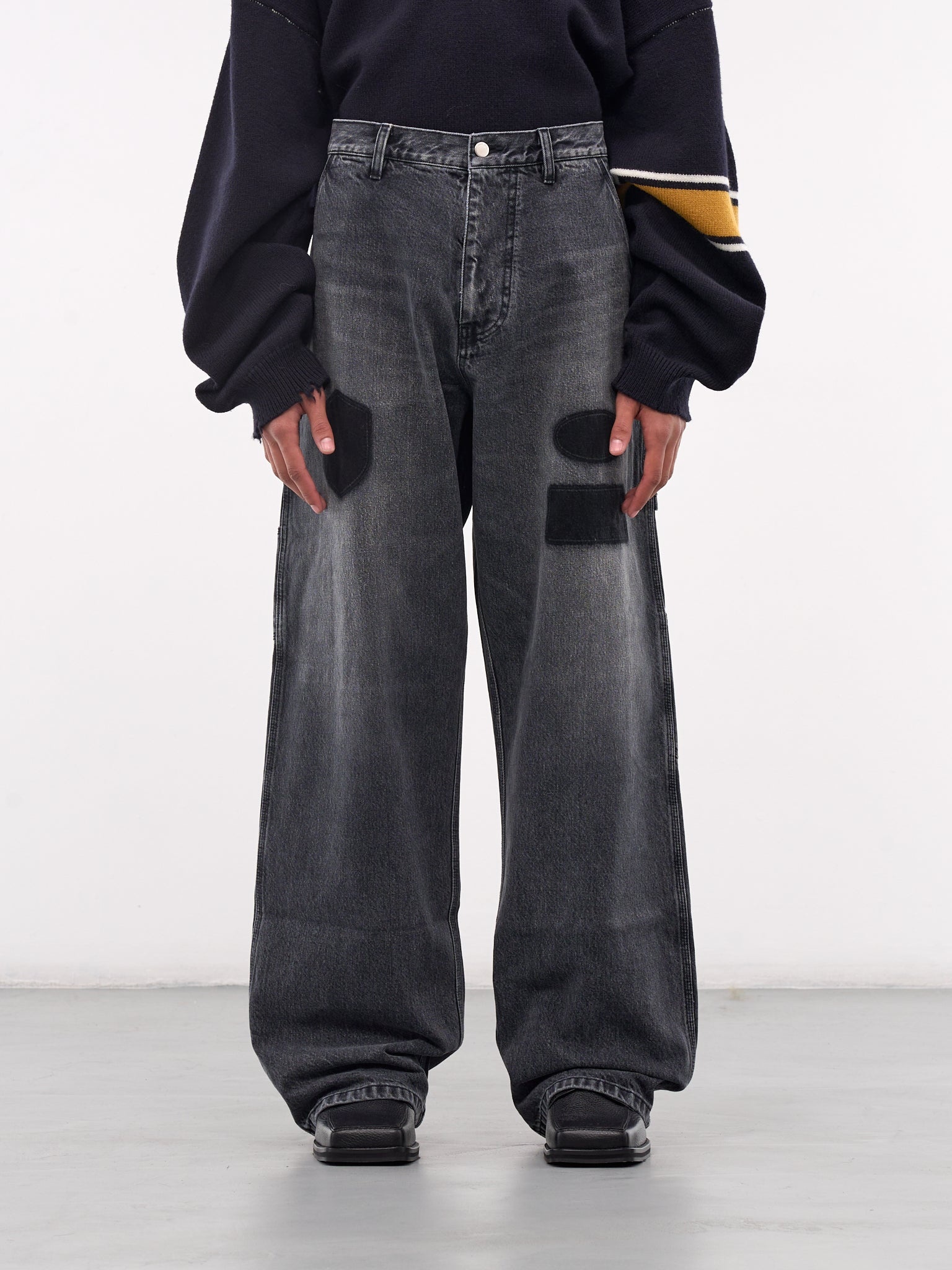 AMBUSH jeans in black, paneled denim construction, fading & deconstructed detailing, belt loops, back logo patch, front button & concealed zip fly closure, inset pockets, back patch pockets, side carpenter's loop, side patch pockets, wide leg, loose fit. Made in Japan 100% Cotton Standard Sizing Model is 5'11.5" wearing size 32. Shoulders: 18" Chest: 36" Waist: 30"