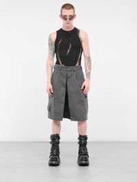 AMBUSH grey shorts, layered wrap design, cotton construction, belt loops, button & concealed zip fly, pleated, back branded patch, back flap pockets, side cargo pockets, below-knee length, relaxed fit. Made in Italy Fabric 1: 100% Cotton Fabric 2: 100% Virgin Wool Standard Sizing Model is 6’0” wearing size M. Shoulders: 19" Chest: 38” Waist: 30”