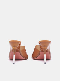 AMINA MUADDI heels in latte, heeled mules design, PVC upper construction, translucent, low-cut, slip-on style, open heel, open pointed toe, stiletto heel, footbed & sole logo embossing, lined. Made in Italy Upper: 100% PVC Lining: 50% Lamb 40% PVC 10% Kid Sole: 90% Calf 10% TPU Italian Sizing