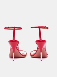AMINA MUADDI heels in red, heeled sandals design, calf leather upper construction, laminated finish, low-cut, slip-on style, ankle pin-buckle strap, open heel, open pointed toe, stiletto heel, footbed & sole logo embossing, lined. Made in Italy Upper: 100% Laminated Calf Leather Lining: 60% Kid 40% Laminated Calf Sole: 90% Calf 10% TPU Italian Sizing