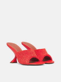 These 'tangerine' orange raffia Taylor mules reinterpret classic slip-ons with a textured, curly upper and a curved spool heel. Finished with an open toe and heel, subtle logo embossing, and rubber injection details at the sole. Featuring: • Rounded open toe and heel • Textured plush-like raffia upper • Padded footbed with embossed logo • 90mm slanted spool heel • Rubbed-injected sole • Made in Italy • Upper: Raffia | Lining: Leather | Sole: Leather • Italian sizing