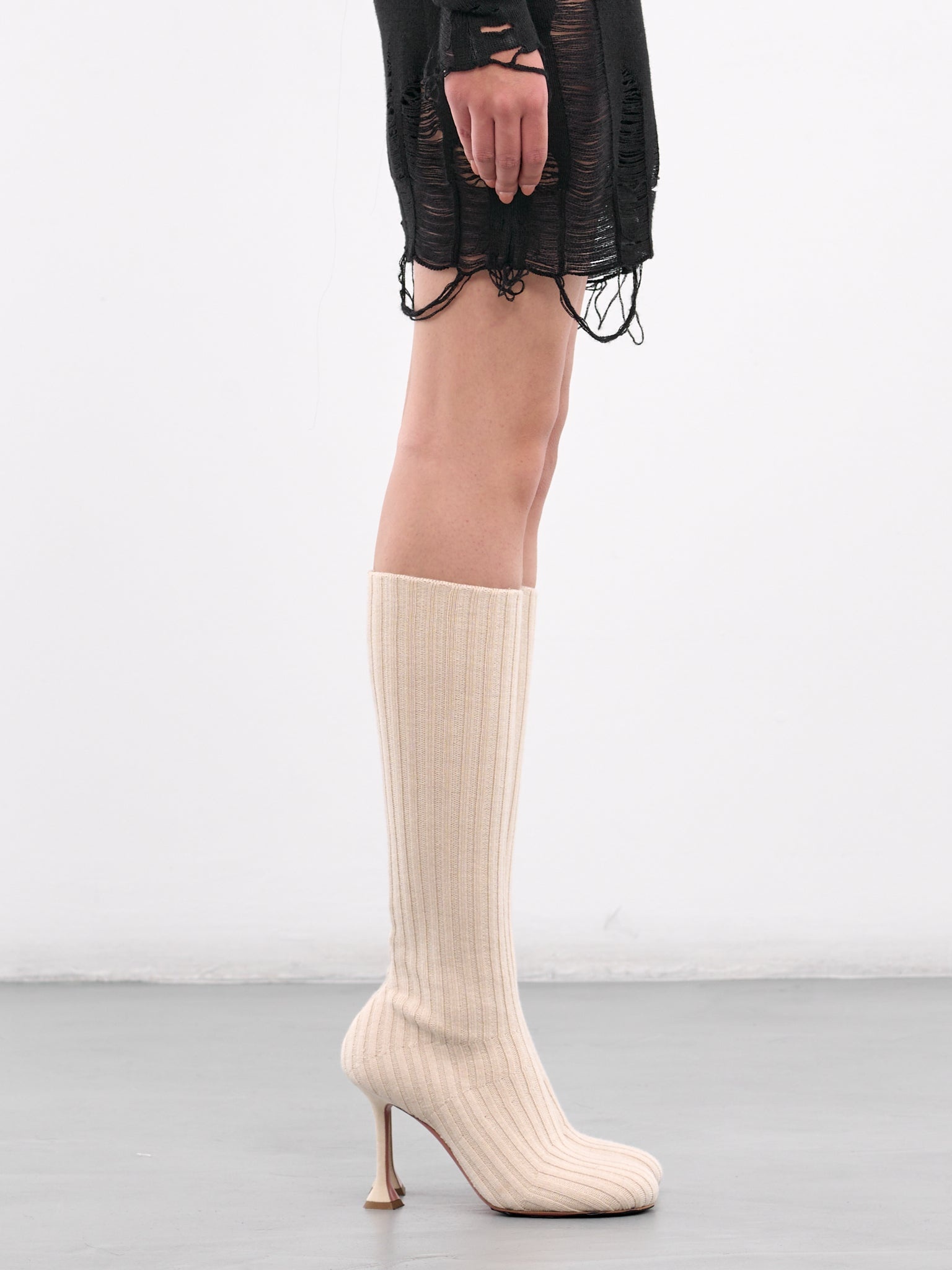 AMINA MUADDI boots in beige, paneled wool-blend knit construction, rib-knit, calf-high, sculptural heel, rounded toe, rubberized leather sole, leather lining. Made in Italy Upper: 93% Wool-Elastane 7% Suede Inner: 67% Cowskin 33% Goatskin Sole: 70% Leather 30% Rubber European Sizing