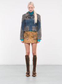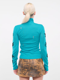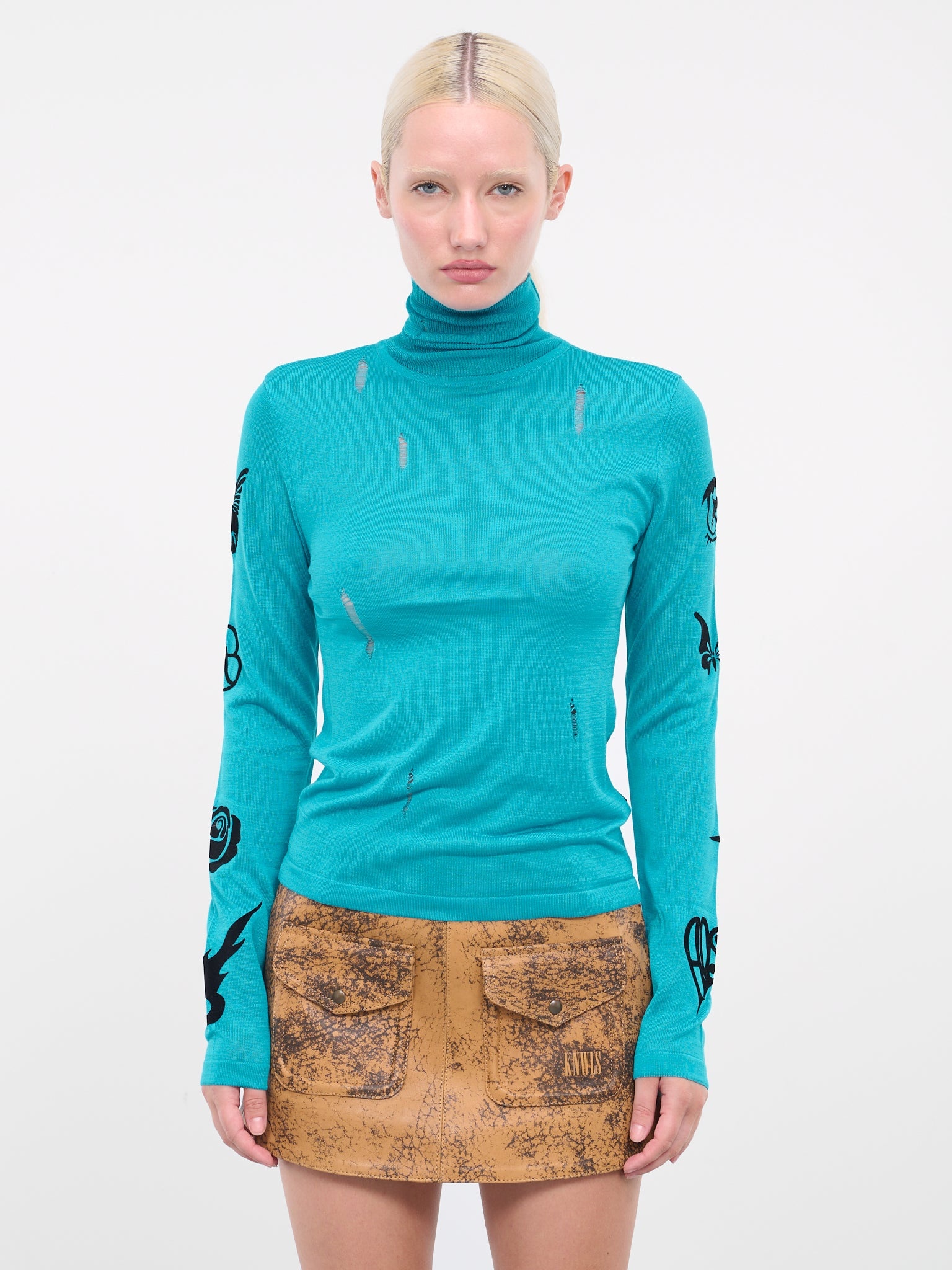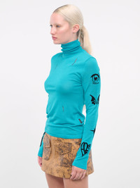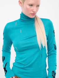 ANDERSSON BELL blue top, knit construction, flocked graphics, ribbed turtleneck, long sleeves, distressed motif, regular fit. Made in Korea Standard Sizing 64% Viscose 29% Lyocell 7% Silk Model is 5'9" wearing size S. Bust: 32" Waist: 24" Hips: 34"