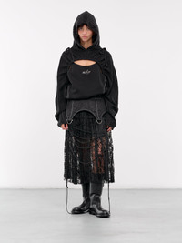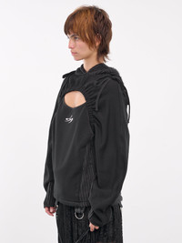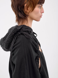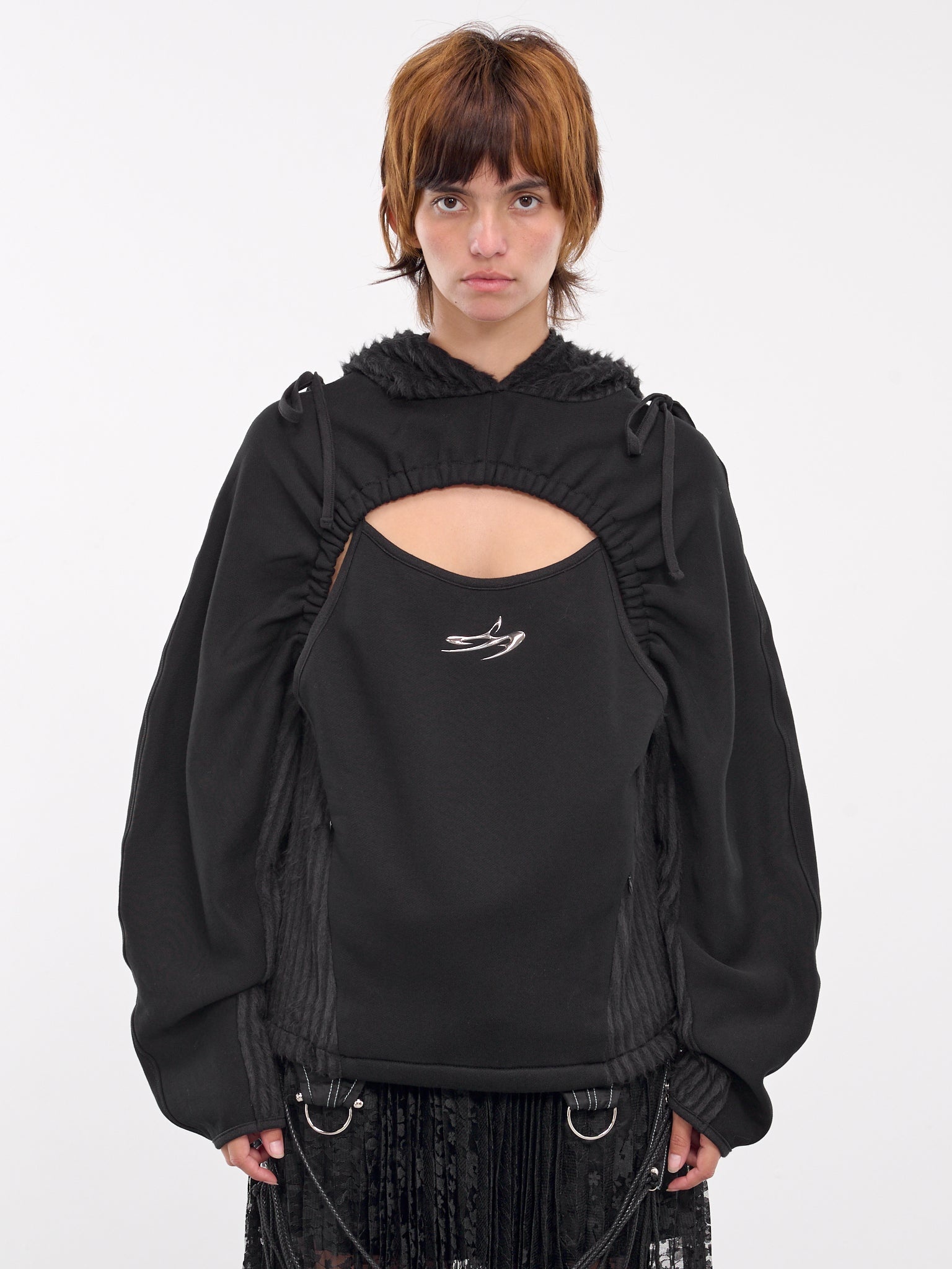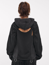 ANDERSSON BELL hoodie in black, layered hybrid design, paneled cotton & poly-blend construction, faux fur contrast paneling, hood, shoulder self-ties, front & back cut-out, shirring along cut-out, long sleeves, side sleeve & bodice faux fur ribbing, curved hem, oversized fit. Made in Korea Outer 1: 100% Cotton Outer 2: 83% Polyester 17% Rayon Standard Sizing
