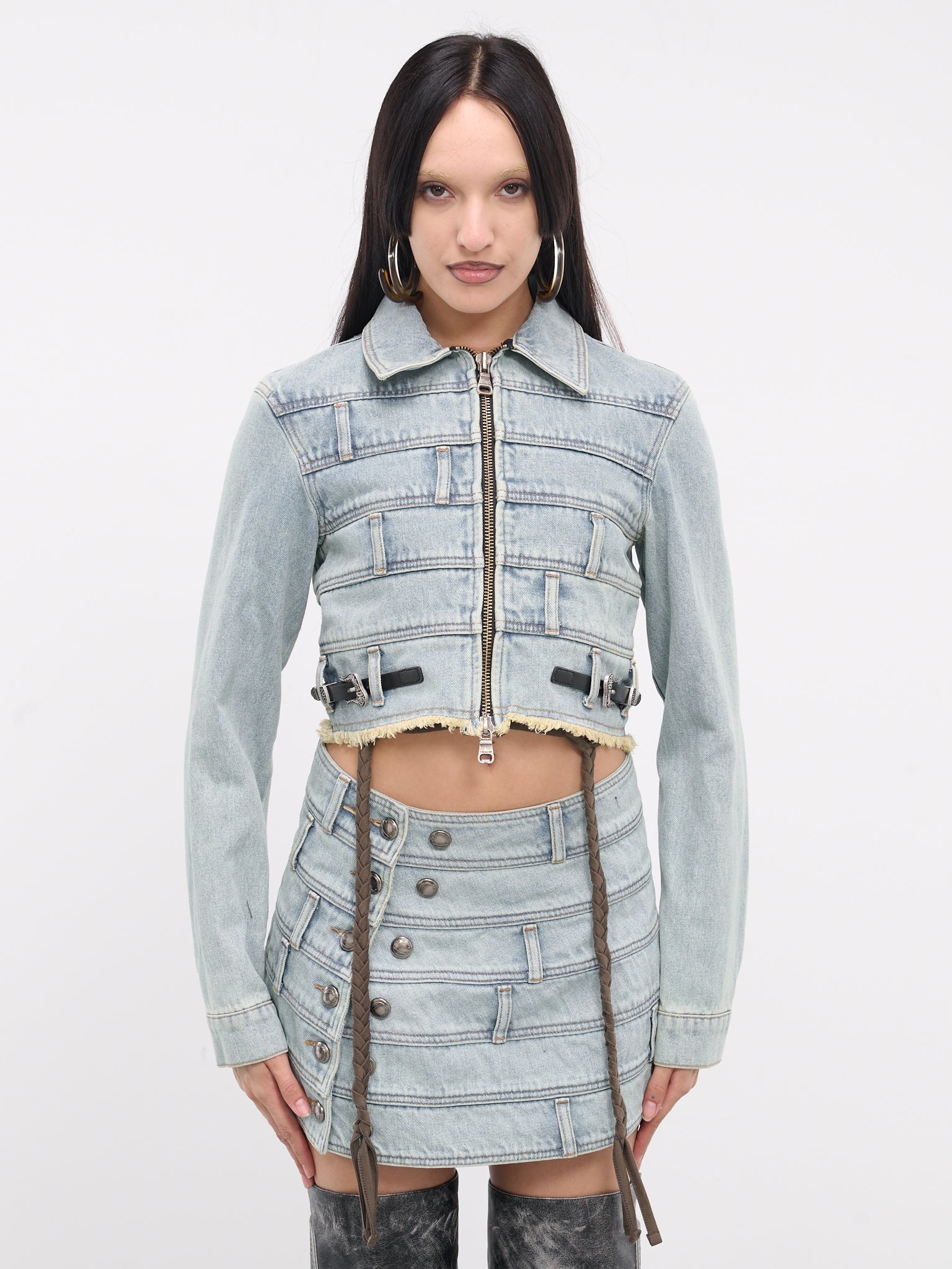 ANDERSSON BELL jacket in light blue, deconstructed design, paneled denim construction, all-over waistband paneling, spread collar, front exposed two-way zip closure, long sleeves, single-button barrel cuffs, side adjustable western pin-buckle belts, back logo patch, frayed hem, cropped length, slim fit. Made in Korea 100% Cotton Standard Sizing Model is 5'8" wearing size S. Bust: 32" Waist: 26" Hips: 34.5"