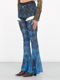 ANDERSSON BELL blue shorts pants, versatile wear, layered design, plaid pattern, shorts: mid-waist, belt loops, button & zip-fly, five pockets, back branded jacron leather patch, denim topstitching, mini length, slim fit, pants: flared silhouette, high-elastic waist, lingerie trim, full length, semi-fitted. Made in South Korea US Sizing Model is 5'8" wearing size 26. Bust: 32" Waist: 26" Hips: 34.5"