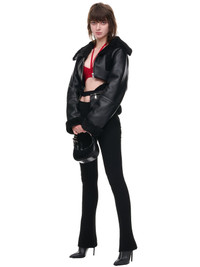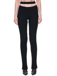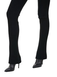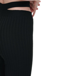 ANDREADAMO pants in black, rib knit construction, stretch fabric, high-waist, cut-out detailing, elastic waistband, elongated length, flared hem, fitted. Made in Italy Standard Sizing 80% Viscose, 10% Polyester, 9% Polyamide, 1% Spandex Model is 5'9" wearing size XS. Bust: 32" Waist: 24" Hip: 34"