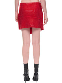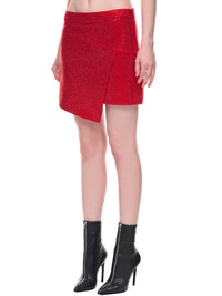 ANDREADAMO skirt in red, wrap design, knit construction, rhinestone embellished, mid-waist, asymmetric hem, mini length, regular fit. Made in Italy Standard Sizing 44% Viscose, 43% Glass, 6% Polyester, 3% Aluminum Model is 5'9" wearing size S. Bust: 32" Waist: 24" Hip: 34"
