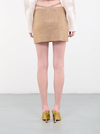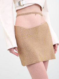 ANDREADAMO skirt in beige, full strass, stretch knit, asymmetric waistline, velcro strap, mini length, slim fit. Standard Sizing Model is 5'10" wearing size S. Bust: 32" Waist: 24" Hips: 35"