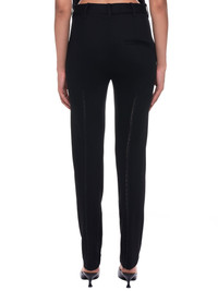 Ann Demeulemeester amedeo trousers in black, adjustable waist with bar-and-hook closure, belt loops, zip-up fly, front waist slash hand pockets, vented/tapered through leg, rear pouch pocket, straight/finished hem, tonal stitching. Made in Portugal. French sizing. Composition - 90% Rayon, 8% Virgin Wool, 2% Elastane Model Measurements: Model is 5ft 6" and wearing a size 38. Bust: 27" Waist: 23" Hip: 32"