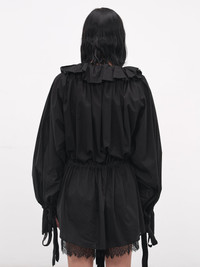 A black mini dress in cotton with voluminous ruffled layering and gathered balloon sleeves. An oversized draped silhouette and gathered waist complete the playful structure. Featuring: • Oversized fit • Cotton construction • Draped silhouette • Voluminous ruffled hems and layering • Balloon sleeves with gathered cuffs • Gathered waist • Mini-length • Made in Italy • 100% Cotton • Standard sizing Model is 5'7" wearing size 38. Bust: 32" Waist: 25" Hips: 34"