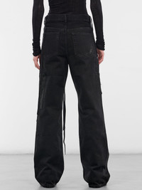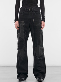 Genoveva relaxed flared trousers in black distressed denim with leather patching and frayed raw hems. Featuring: • Relaxed fit • Wide flared leg • Distressed heavyweight denim construction • Leather patches and grosgrain ribbon detailing • Belt loops • Front button and zip fly closure • Five-pocket styling • Frayed and raw hems • Made in Italy • Main: 100% Cotton • Italian sizing Model is 5'9" wearing size 38. Bust: 32" Waist: 25" Hips: 34"