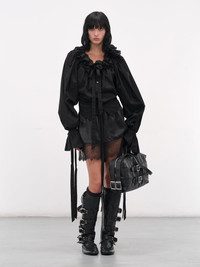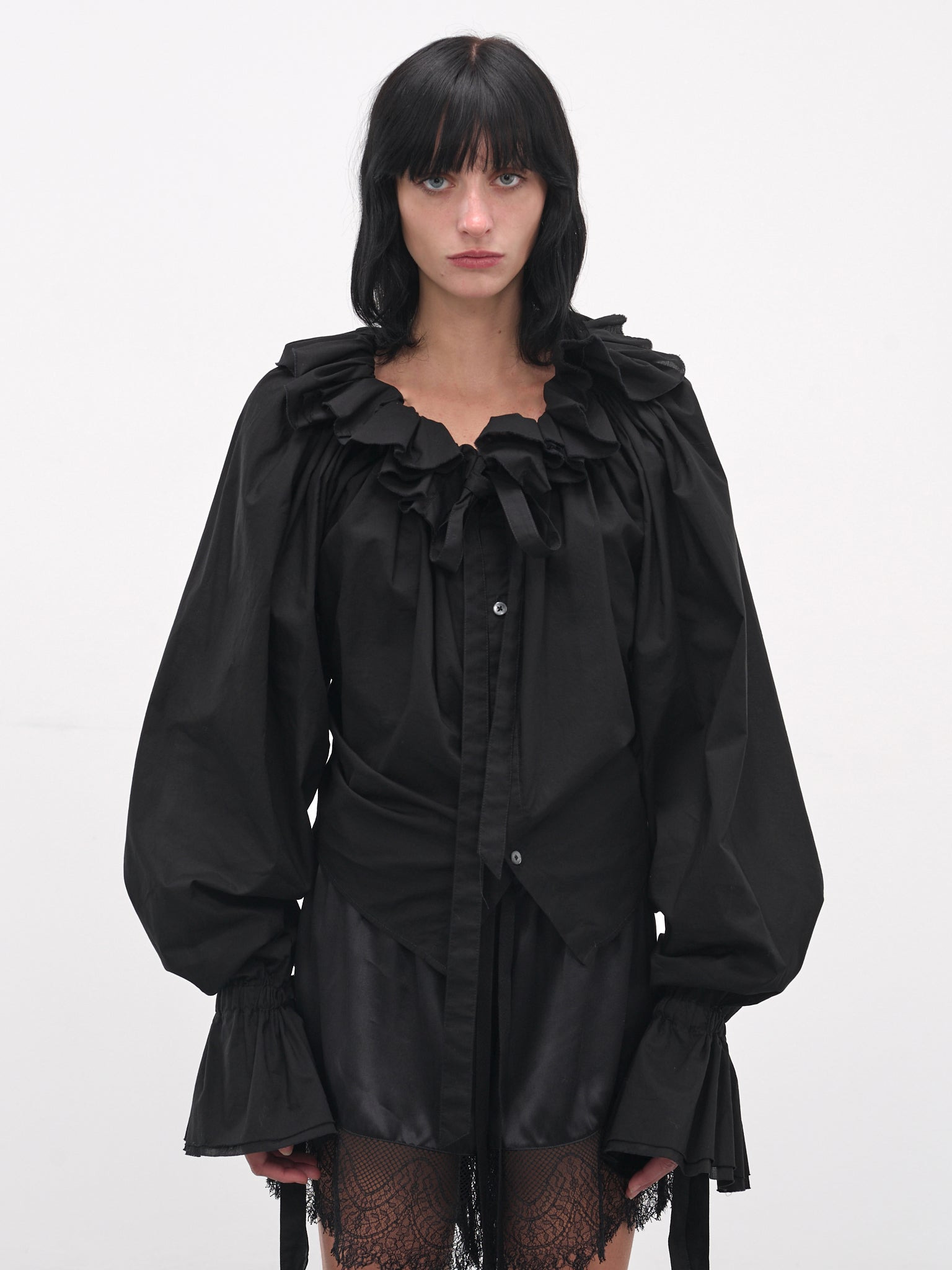 A black cotton poplin top with a cropped oversized silhouette and voluminous ruffled hems. Balloon sleeves, gathered cuffs, and self-tie draping at the back complete the layered construction. Featuring: • Oversized fit • Lightweight cotton poplin construction • Draped silhouette • Voluminous ruffled hems and layering • Balloon sleeves with gathered cuffs • Self-tie fastening and draping at back • Cropped length • Made in Italy • 100% Cotton • Standard sizing Model is 5'7" wearing size 40. Bust: 32" Waist: 25" Hips: 34"