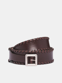 A brown wide leather belt with all-over whipstitch embellishment. A pin-buckle fastening with logo engraving completes the structured silhouette. Featuring: • Adjustable fit • Leather construction • All-over whipstitch embellishment • Wide width • Pin-buckle fastening • Logo engraving at buckle • Silver-tone hardware • Made in Italy • 100% Calf leather • Sizing in centimeters