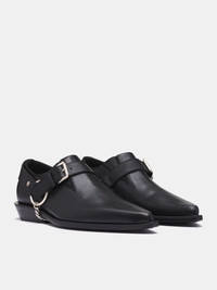 ANN DEMEULEMEESTER boots in black, low-cut cowboy boots design, paneled Nappa leather construction, low-top, slip-on style, side elastic gussets, adjustable pin-buckle harness strap, chainlink attachment, micro Cuban heel, pointed toe, leather sole, lined. Made in Italy 100% Calf Leather Italian Sizing