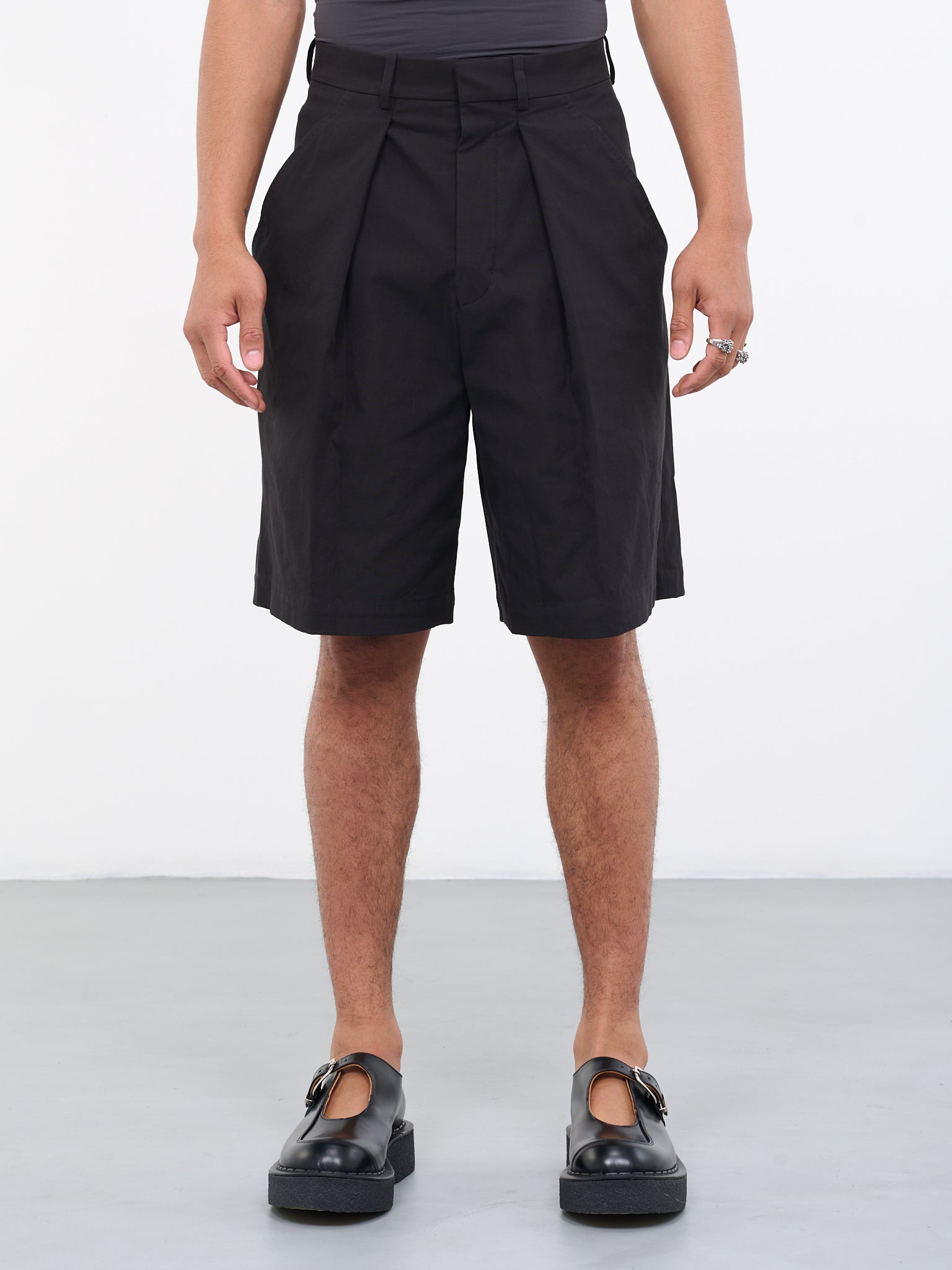 ANN DEMEULEMEESTER shorts in black, cotton voile, high-waist, belt loops, hook eye & zip fastening, front pleats, side, back flap & welt pockets, wide leg, regular fit. Made in Italy European Sizing 100% Cotton Model is 6’1” wearing size 48. Shoulders: 19” Chest: 38” Waist: 30”