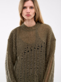 ANN DEMEULEMEESTER sweater in green, mohair-silk blend, paneled knit construction, rib-knit, heavy distressing, crewneck, dropped shoulders, long sleeves, straight hem, relaxed fit. Made in Italy 70% Mohair 30% Silk Standard Sizing Model is 5'9" wearing size S. Bust: 32" Waist: 23" Hips: 34"