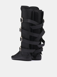 ANN DEMEULEMEESTER boots in black, leather construction, knee-high, leather stitching trimside wrap, buckled ring straps, signature rivets, low-profile leather sole, lined. Made in Italy 100% Bovine Leather Italian Sizing