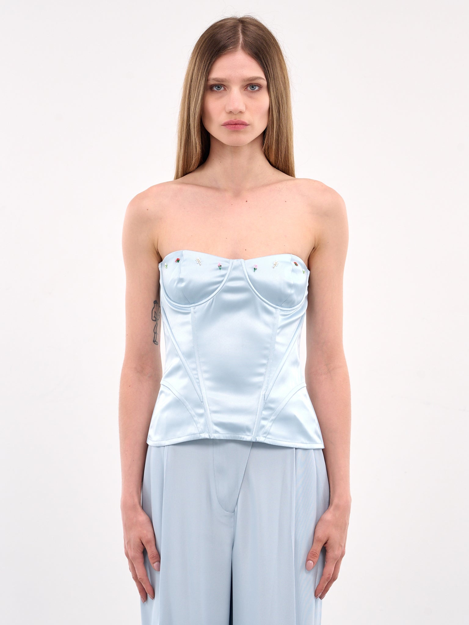 ANNA OCTOBER corset in light blue, paneled stretch poly construction, sweetheart neckline, strapless, front graphic beaded embellishment, back exposed zip closure, corset boning, curved hem, slim fit. 96% Polyester 4% Elastane Standard Sizing Model is 5'9" wearing size S. Bust: 32" Waist: 23" Hips: 34"