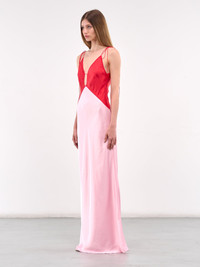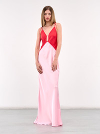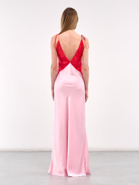 ANNA OCTOBER dress in red & light pink, viscose-poly blend, paneled construction, two-tone dye, v-neckline, self-tie shoulder straps, sleeveless, armscyes, partially open back, front cut-out, flared hem, floor-length, relaxed fit. 57% Viscose 43% Polyester Standard Sizing Model is 5'9" wearing size S. Bust: 32" Waist: 23" Hips: 34"