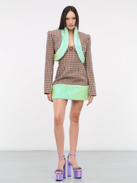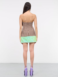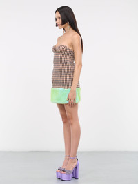 AREA brown & green dress, woven check pattern, strapless, sweetheart neckline, crystal embellishment, cinched waist, back zip closure, fur trim, fully lined, fitted. Numeric Sizing Model is 5'8" wearing size 2. Bust: 32" Waist: 26" Hips: 34.5"