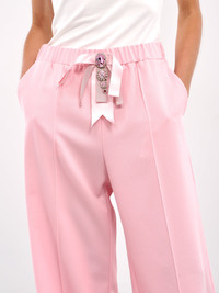 AREA pants in pink, paneled wool construction, elasticated waistband, front bow & crystal embellishment, traveler's crease, inset pockets, lined, wide leg, relaxed fit. Made in Italy Outer: 100% Virgin Wool Inner: 100% Viscose Standard Sizing Model is 5'8" wearing size S. Bust: 32.5" Waist: 24" Hips: 34"