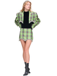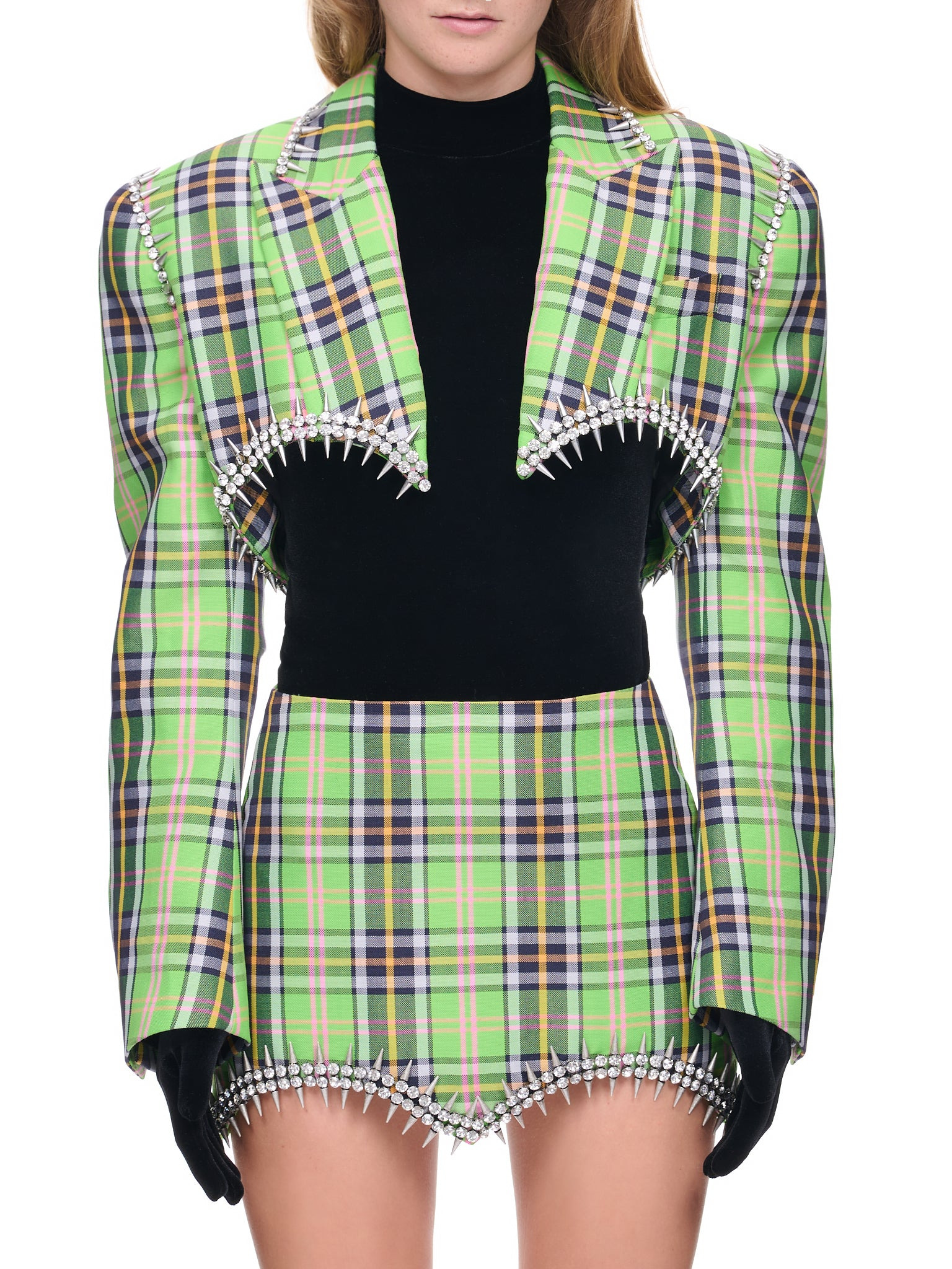 AREA STUDIO blazer in green, plaid twill, crystal spike trim, heart scalloped hem, lapel collar, padded shoulders, button closure & cuffs, cropped. Imported Numeric Sizing Composition: 57% Virgin Wool, 43% Polyester Model is 5'9" and is wearing size 2. Bust: 32" Waist: 24" Hip: 34"