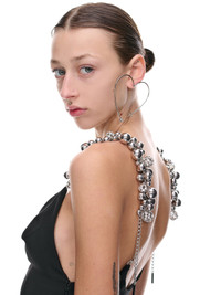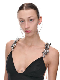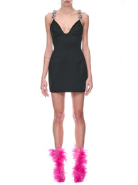 AREA STUDIO dress in black, pointe jersey, low v-neck, adjustable grape cluster shoulders straps, concealed side seam zip closure, open back, mini length, fitted. Made in India Standard Sizing 67% Rayon, 28% Nylon, 5% Spandex, Metal Model is 5'9" 5wearing size S. Bust: 33" Waist: 24" Hip: 33"