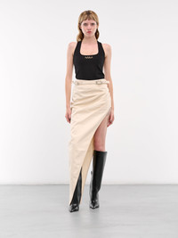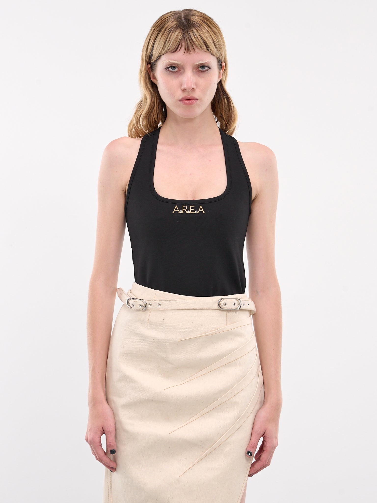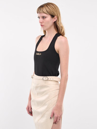 AREA tank in black, rayon-nylon blend, paneled construction, scoop neck, shoulder straps, sleeveless, armscyes, front metal logo plaque, racerback, slim fit. Made in Italy 67% Rayon 28% Nylon 5% Elastane Standard Sizing Model is 5'8" wearing size XS. Bust: 32" Waist: 24" Hips: 34"