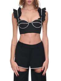 AREA STUDIO top in black, cotton poplin, bustier design, low square neckline, ruffle straps, crystal cupchain trim, back zip closure, cropped, fitted. US Sizing 100% Cotton, Glass Crystal Model is 5'9" wearing size 0. Bust: 33" Waist: 24" Hip: 33"