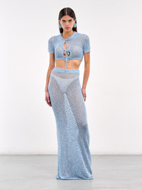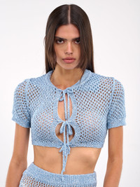 AREA cardigan in light blue, paneled crochet nylon construction, loose crochet, round neck, front self-tie fastenings, front cut-outs, short sleeves, straight hem, cropped length, slim fit. Made in Italy 100% Polyamide Standard Sizing Model is 5'8" wearing size S. Bust: 32.5" Waist: 24" Hips: 34"