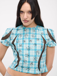ASHLEY WILLIAMS top in blue, paneled cotton construction, blue check pattern, graphic bow print, mesh paneling, crewneck, short sleeves, darting, curved hem, cropped length, slim fit. Made in India 100% Cotton Standard Sizing Model is 5'8" wearing size XS. Bust: 32" Waist: 26" Hips: 34.5"