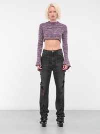AVAVAV black pants, non-stretch denim, faded treatment, cut-outs, leg drawstring detailing, high-waist, belt loops, button & zip-fly, four pockets, back stitched graphic slim fit. Made in Italy 100% Cotton US Sizing Model is 5'9" wearing size 26. Bust: 32" Waist: 24" Hips: 34"