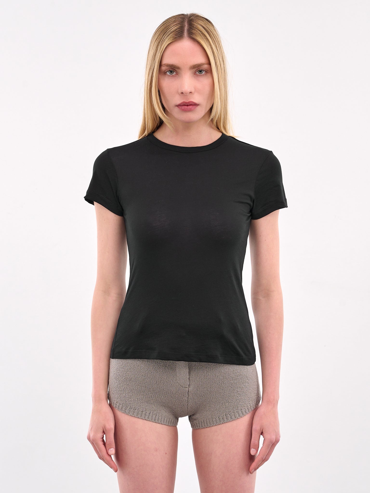 AYA MUSE t-shirt in black, paneled cotton construction, crewneck, short sleeves, back signature patch, straight hem, slim fit. Made in Portugal 100% Cotton Standard Sizing Model is 5'8" wearing size S. Bust: 32" Waist: 24" Hips: 35"