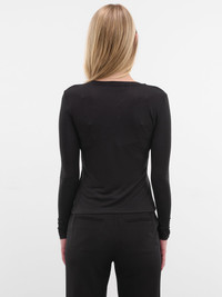 A black semi-sheer modal T-shirt with a soft, second-skin feel. The round neckline and long sleeves refine its minimalist, body-contoured silhouette. Featuring: • Slim fit • Modal construction • Semi-sheer finish • Round neck • Long sleeves • Made in Portugal • 100% Modal • Standard sizing Model is 5'8" wearing size S. Bust: 32" Waist: 23" Hips: 34"