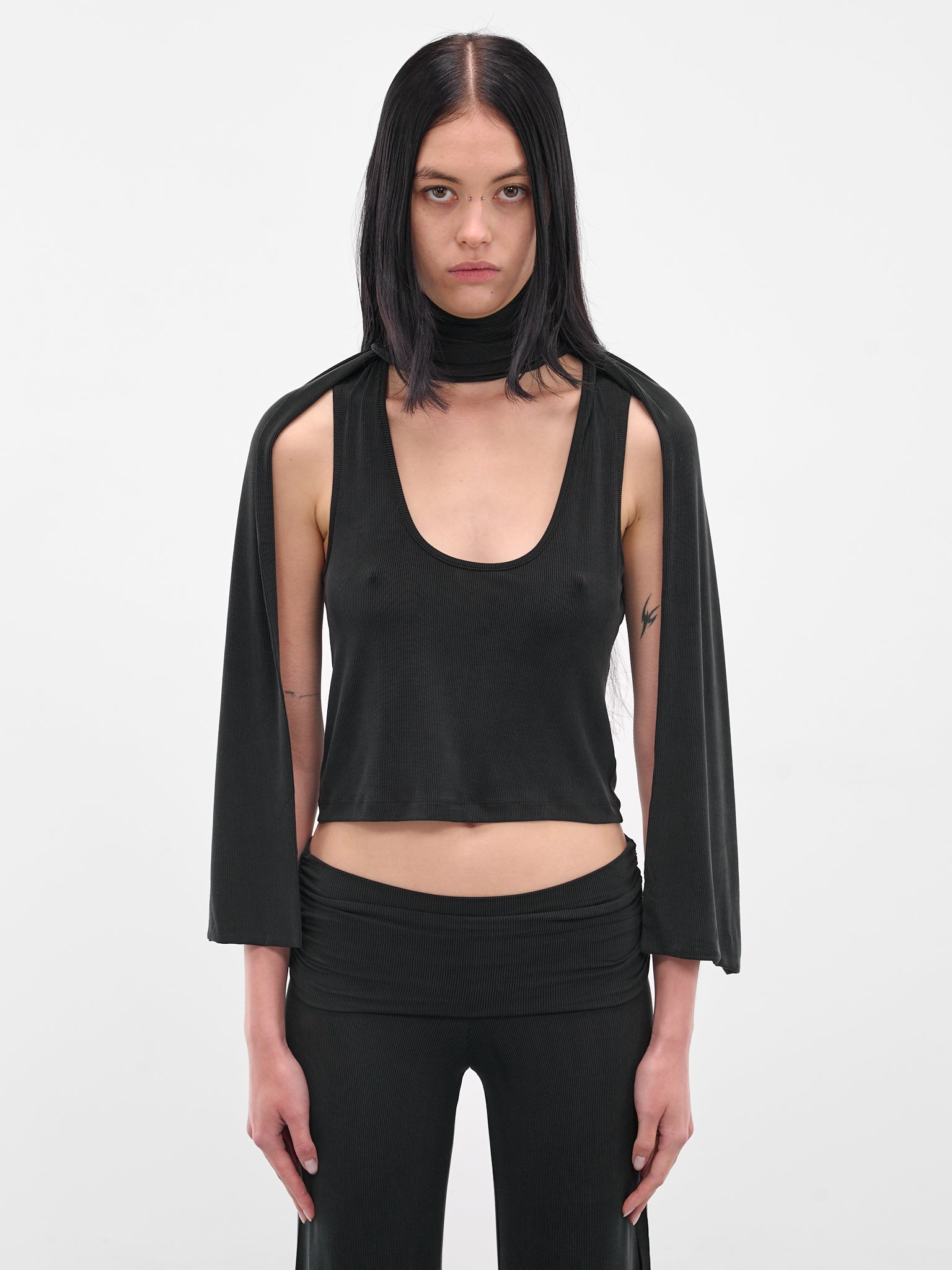The black Scarf Scoop Tank Top features rib-knit construction, a wraparound scarf, and sculptural draping for a cropped, slim profile. Featuring: • Slim fit • Scoop neck with shoulder straps • Wraparound scarf with draping • Sleeveless with armholes • Rib-knit construction • Cropped length • Made in Portugal • 96% Cupro 4% Elastane • Standard sizing Model is 5'8" wearing size S. Bust: 28.5" Waist: 22.5" Hips: 33.5"