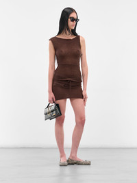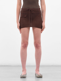 The brown Blaine Mini Skirt features a semi-sheer knit with three flap pockets and an adjustable drawstring waist, blending functional detail with a slim mini profile. Featuring: • Slim fit • Adjustable drawstring waist • Three flap pockets • Semi-sheer knit construction • Mini-length • Made in China • 42% Rayon 30% Mohair 18% Wool 10% Silk • Standard sizing Model is 5'8" wearing size S. Bust: 28.5" Waist: 22.5" Hips: 33.5"