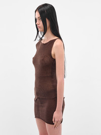 The brown Blaine Top showcases a semi-sheer knit with a round neck and slender shoulder straps, emphasizing its airy, slim silhouette. Featuring: • Slim fit • Round neck with shoulder straps • Sleeveless with armholes • Semi-sheer knit construction • Made in China • 42% Rayon 30% Mohair 18% Wool 10% Silk • Standard sizing Model is 5'8" wearing size S. Bust: 28.5" Waist: 22.5" Hips: 33.5"