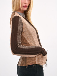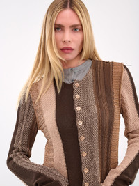 AYA MUSE cardigan in latte, cotton-nylon blend, paneled knit construction, various knit pattern styles throughout, loose thread detailing, round neck, front button closure, long sleeves, front patch pockets, straight hem, slim fit. Made in China 64% Cotton 36% Nylon Standard Sizing Model is 5'8" wearing size S. Bust: 32" Waist: 24" Hips: 35"